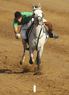 In tent pegging, a rider galloping on a horse back with a lance or a sword pierces and picks a wooden peg from the ground.
